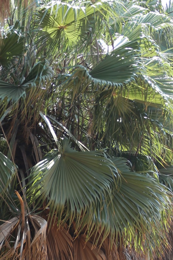 LEAVES:ever green broadleaves, gray-green palmate (fan-shaped) leaves each 3-6 ft. (0.9-1.8 m) across, alternate, costapalmate, entire leaf margin, star-shaped leaves, leaf blade length: >36 inches, leaves circular in outline, divided from the middle into 70-75 segments, segments glabrous, pendulous and swing freely in the wind, filamentous on the margin and at the apex, a long thread hanging at the sinus of each segment; costa prominent, hastula at the apex of petiole triangular, whitish, spongy. Petiole long, plano-convex, margin of the lower portion spinous, spines yellow, hooked, hard. When the fronds die, they remain attached and drop down to cloak the trunk in a wide skirt.