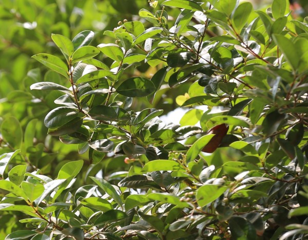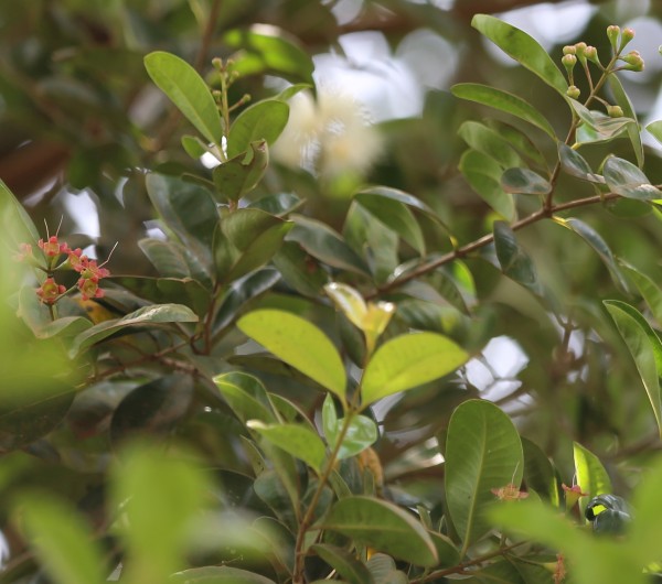 LEAVES: opposite, simple, rounded and bright, glossy green in color, lanceolate from 4–8 cm long. Leaf blades rather small, about 3.3-9.5 x 1.2-3.2 cm. oil dots visible with a lens if not visible to the naked eye. Oil dots rather sparsely scattered. Leafy twigs generally 4-angled or shortly 4-winged, pairs of wings running down from each petiole but amalgamating and forming a pocket or hump above the next lower pair of leaves.