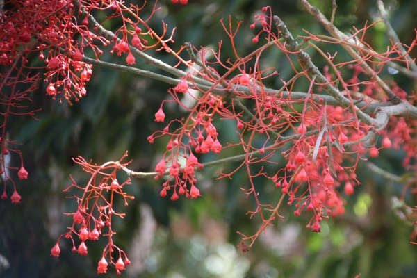 FLOWERS: Scarlet-red, bell-shaped, petal-less, with 5 partially-fused waxy sepals, produced in large terminal panicles on leafless branches. Blooming may be partial and with varying intensity, but whole tree may be spectacularly covered with flowers after prolonged period of dryness.